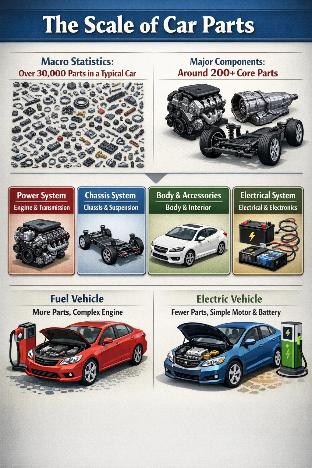 Om vi ändrar vårt perspektiv och betraktar komplexa mekaniska sammansättningar som motorn, transmissionen och chassit som enstaka enheter, så består en bil av ungefär flera hundra huvudkomponenter. Denna klassificering är närmare vad vi brukar höra i verkstäder.