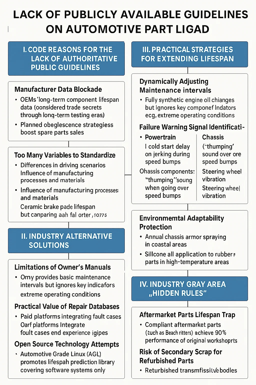 • Tillverkardatablockad: OEM-tillverkares ackumulerade komponentlivslängdsdata (såsom tröskelvärden för kamremsbrott och lagerförslitningskurvor) genom långtidstester anses vara affärshemligheter och avslöjas inte offentligt.
