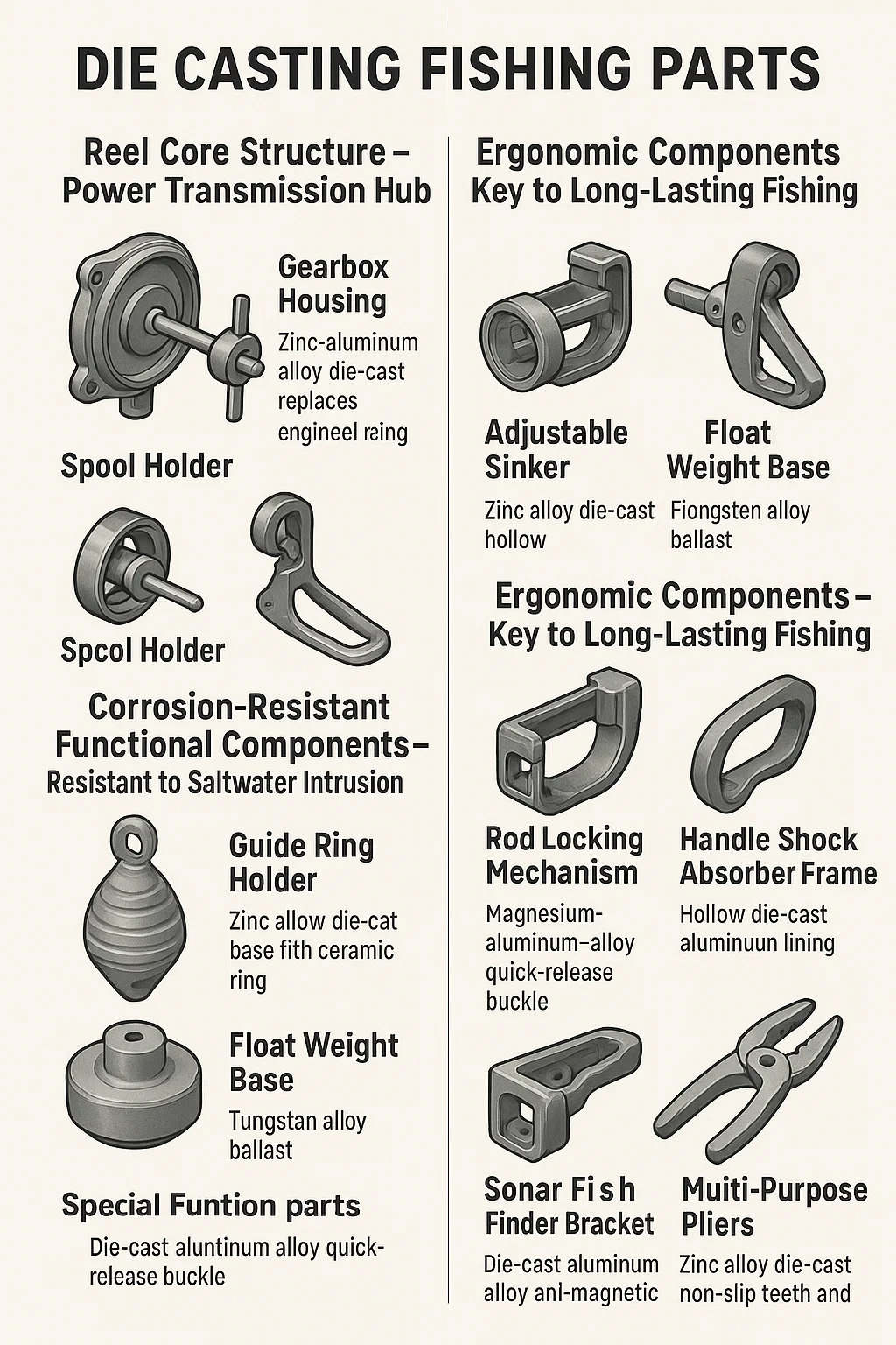 Die gjutning av fiskedelar är kärnmetallkomponenter tillverkade med en högtrycksgjutningsprocess. De hanterar nyckelfiske -krav som lättviktning, korrosionsbeständighet och funktionell tillförlitlighet. Viktiga applikationer och funktioner är följande: