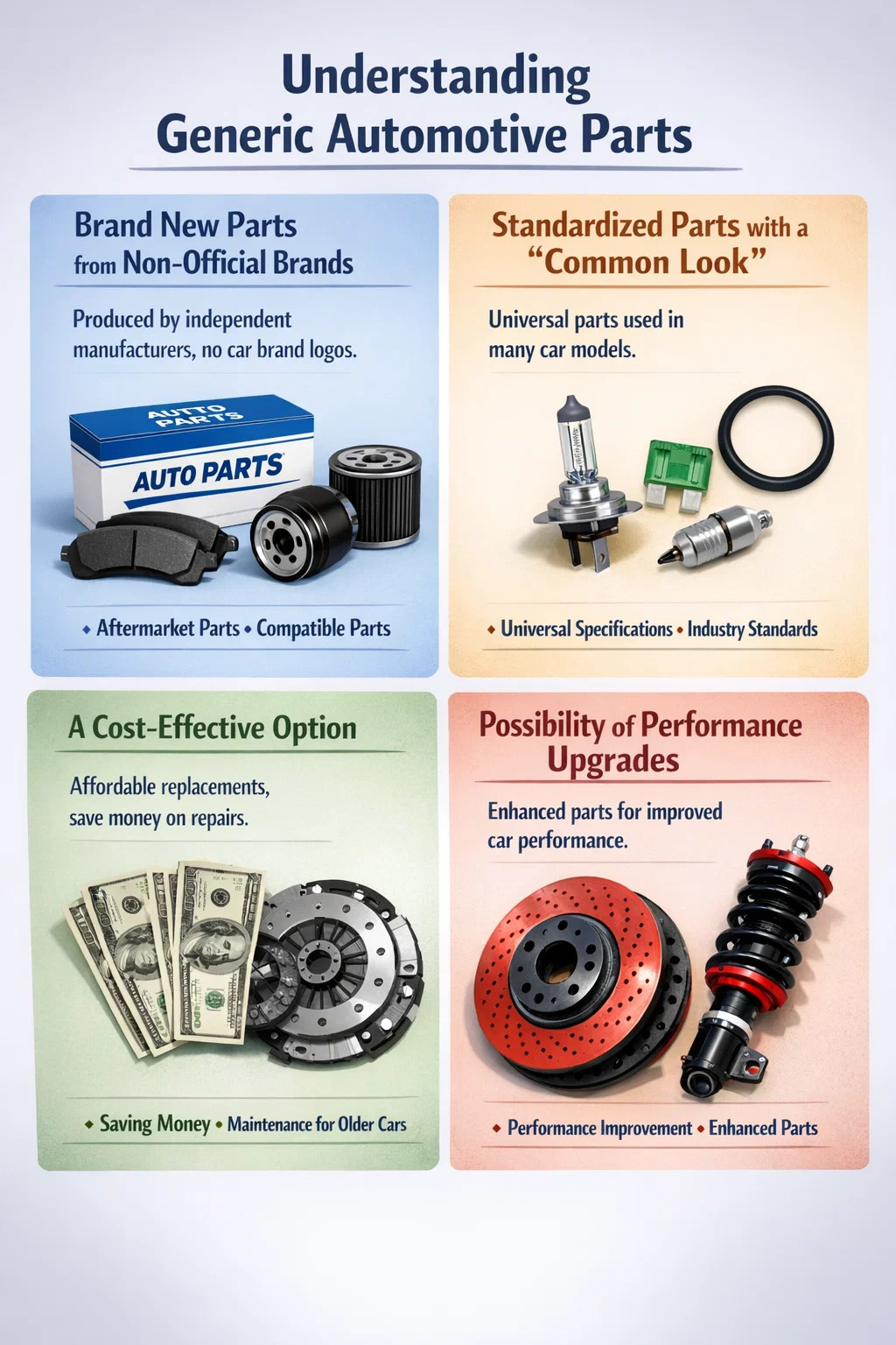Enkel förklaring: Många väljer dessa bildelar eftersom de är billigare. Eftersom de eliminerar märkespremien och licensavgifterna för biltillverkaren, är dessa delar vanligtvis betydligt billigare än originaldelar köpta från en 4S-butik (auktoriserad återförsäljare). För äldre bilar som saknar garanti är att byta ut delar med dessa nya generiska delar ett mycket kostnadseffektivt alternativ.