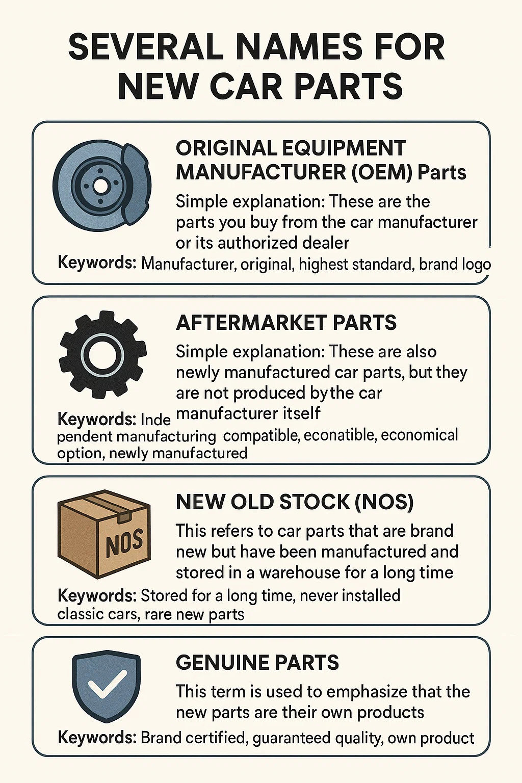 Enkel förklaring: Denna term används vanligtvis av tillverkare för att betona att de nya delarna är deras egna produkter. Det påminner mycket om OEM-delar, vilket betonar att dessa bildelar är märkescertifierade och av garanterad kvalitet.