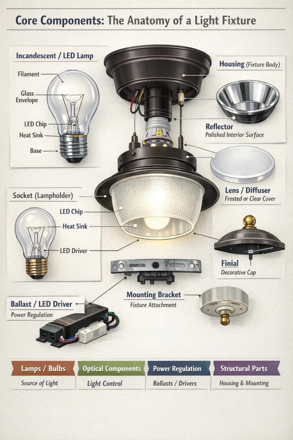 En armatur, ofta kallad i tekniska termer som en armatur, är sammansatt av flera olika belysningsdelar som arbetar unisont för att ge belysning. De mest grundläggande delarna inkluderar lampaa (glödlampa) , den uttag , den hölje (fixturkropp) , och lins eller diffusor . Medan glödlampan skapar ljuset är de andra komponenterna ansvariga för att hålla glödlampan på plats, skydda den och rikta ljusstrålen till önskat område.