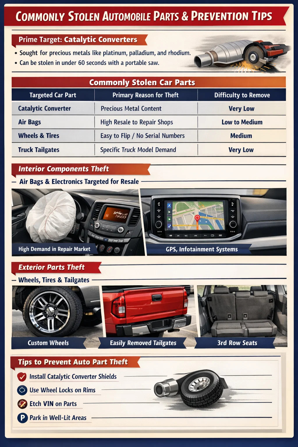 Tjuvar fokuserar i allmänhet på bildelar som är lätta att ta bort och svåra att spåra. Följande tabell visar de vanligaste målen och varför de blir stulna.