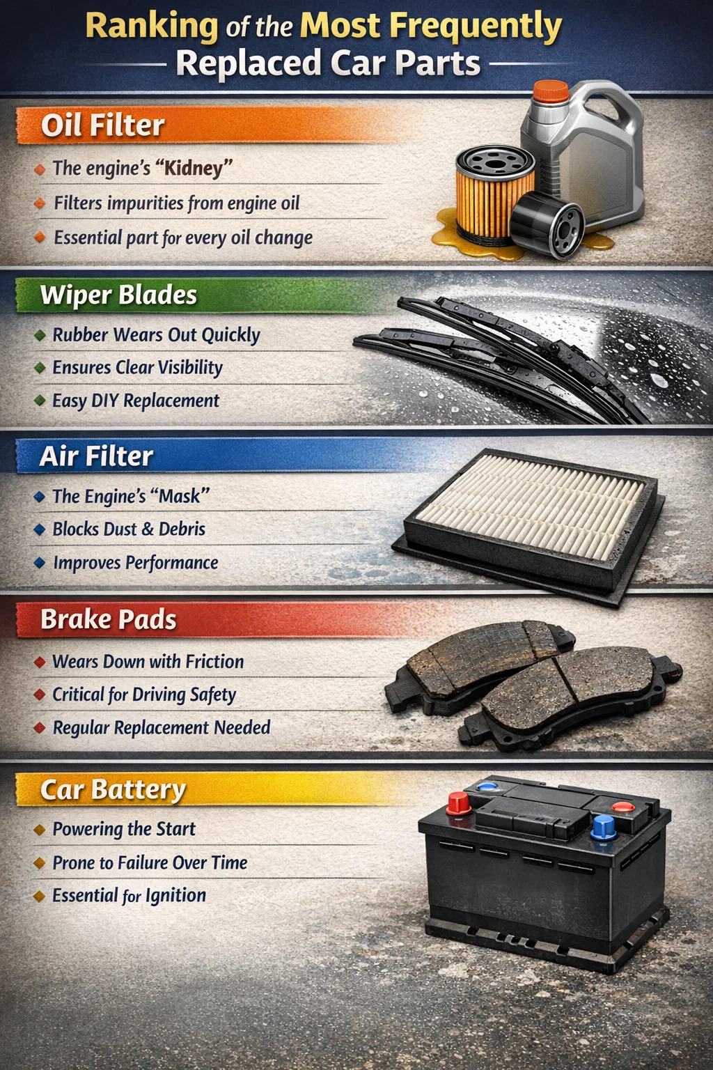 I den dagliga användningen av en bil är vissa delar som strumpor eller skosulor vi bär – de är "förbrukningsartiklar" som måste bytas ut regelbundet. Om vi var tvungna att välja den bildelar som oftast behöver bytas ut så skulle det definitivt vara filter och slitagedelar.